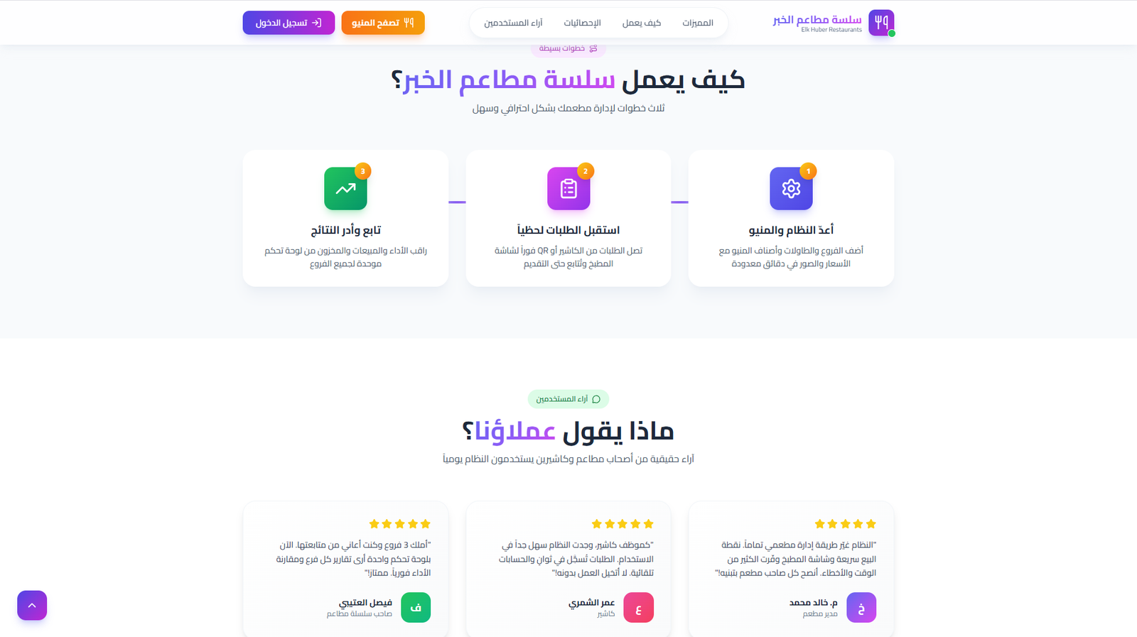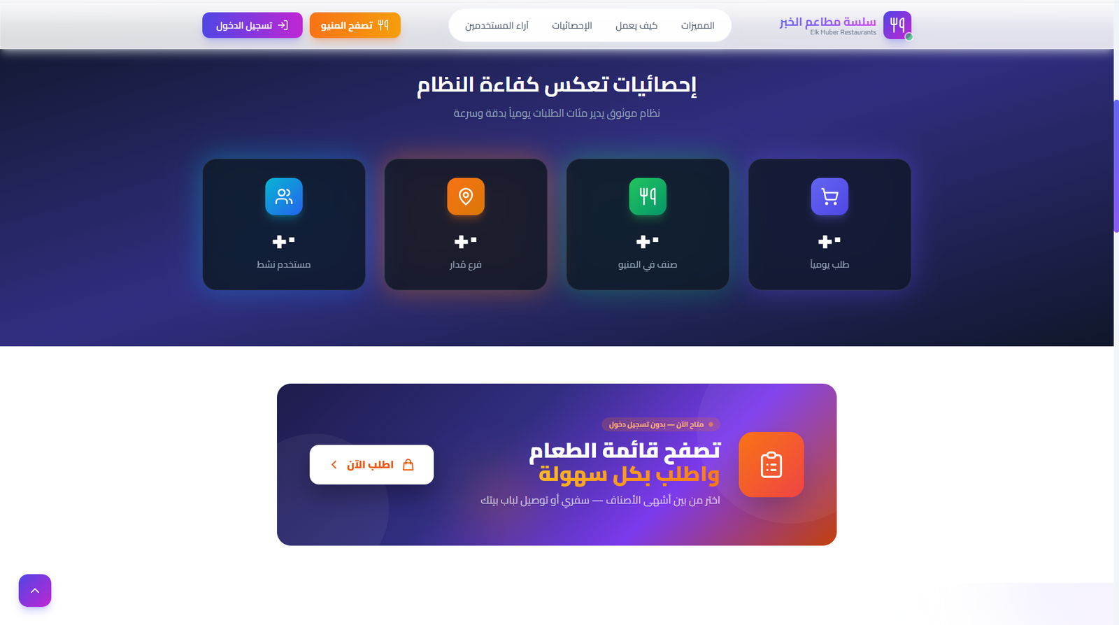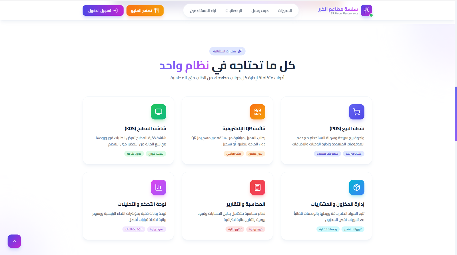 نظام شامل لإدارة الطلبات، المخزون، المحاسبة والموظفين بكفاءة عالية. نقطة بيع متطورة، قائمة QR تفاعلية، ولوحة تحكم ذكية.
