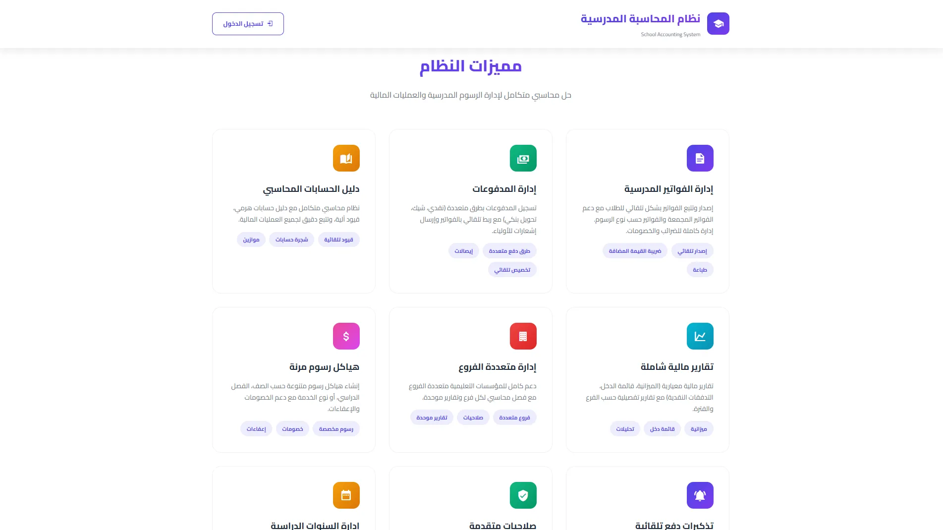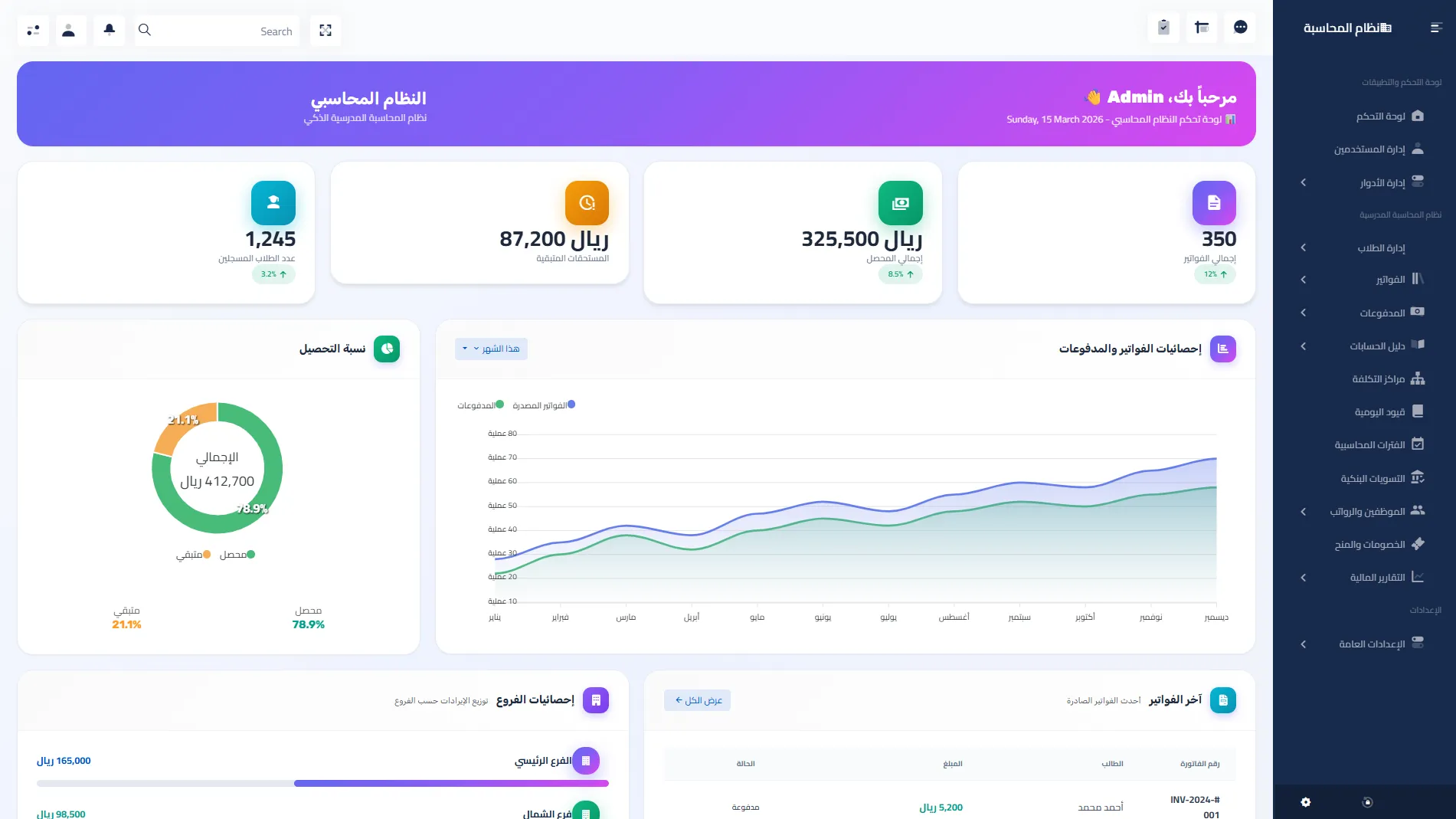 منصة محاسبية متكاملة لإدارة الرسوم المدرسية، الفواتير، والمدفوعات. تتبع دقيق للحسابات، إدارة الفروع، تقارير مالية شاملة، وتحليلات محاسبية متقدمة.