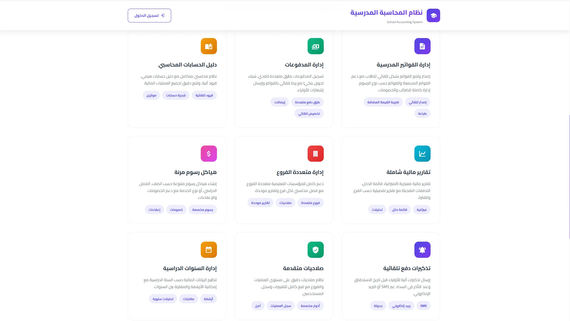 منصة محاسبية متكاملة لإدارة الرسوم المدرسية، الفواتير، والمدفوعات. تتبع دقيق للحسابات، إدارة الفروع، تقارير مالية شاملة، وتحليلات محاسبية متقدمة.